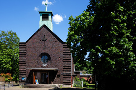 Serm: Die sehr schlichte Kirche besticht duch ein großes Glasmosai aus dem Jahr 1961, das auf einem Entwurf von Professor Gustav Fünders basiert und den Bezug zum "Herz-Jesu" bildet. Ebenso weist der Altar aus Basalt auf diese Thematik hin.