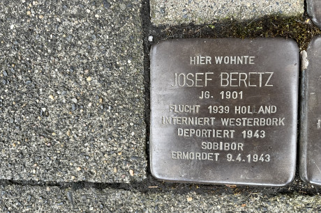 Josef Beretz wurde am 05.12.1901 als Sohn von Alexander Beretz und Sibilla Beretz, geb. Stein in Gindorf geboren, zwei Geschwister sind bekannt: Josefine und Johanna. Nach der Flucht im Jahr 1939 nach Amsterdam wurde Josef im Durchgangslager Westerbork interniert. Von dort aus wurde er am 06.04.1943 ins Vernichtungslager Sobibor deportiert, wo er am 09.04.1943 ermordet wurde.