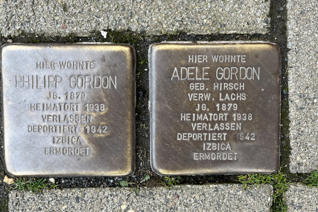 Auf dem Wiler 30: Philipp Gordon wurde am 04.11.1879 als Sohn von Jacob Gordon und Caroline Gordon, geb. Esser in Köln geboren, als Beruf wird "Metzger und Händler" angegeben. Philipp heiratete Adele Hirsch, ein Kind (Karoline *11.01.1911)[170] ist bekannt. Nachdem Philipp im Jahr 1938 seinen Heimatort mit Ziel Aachen (Quelle, strittig: Diese Quelle nennt Wuppertal) verlassen musste, wurde er am 22.04.1942 ab Düsseldorf ins Ghetto Izbica deportiert, wo er ermordet wurde.
