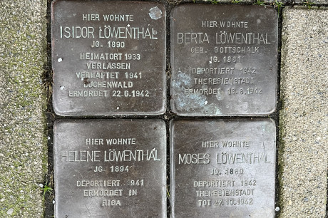 Christian-Kropp-Str. 10: Moses Löwenthal wurde am 18.05.1860 als Sohn von Joseph Löwenthal und Helene Löwenthal, geb. Wolf in Gustorf geboren, als Beruf wird Handelsvertreter angegeben. Er heiratete Berta Gottschalk, zwei Kinder sind bekannt: Helene und Isidor. Moses wurde am 21.07.1942 mit dem Transport VII/1, Zug Da 70 ab Düsseldorf ins Ghetto Theresienstadt deportiert, wo er am 27.10.1942 ermordet wurde. Er wurde 82 Jahre alt.