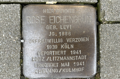 Kölner Str. 38: Alice Rothschild wurde am 10.02.1895 als Tochter von Gustav Rothschild und Ida Rothschild, geb. Herz in Grevenbroich geboren, eine Schwester (Käthe) ist bekannt. Alice heiratete Adolf Levy (* und † unbekannt). Nach einem – sehr wahrscheinlich unfreiwilligen – Umzug nach Köln im Jahr 1935 wurde Alice am 30.10.1941 ab Köln ins Ghetto Litzmannstadt verbracht. Hinsichtlich des Todeszeitpunkts und -ort weichen die bekannten Quellen voneinander ab: Diese Quelle berichtet von einer Deportation am 26.06.1944 von Lodz in das Vernichtungslager Kulmhof, wo im gleichen Monat umgebracht wurde, diese Quelle gibt als Todesort das Ghetto Lodz an, ein Todesdatum wird hier nicht angegeben. Sie wurde 49 Jahre alt