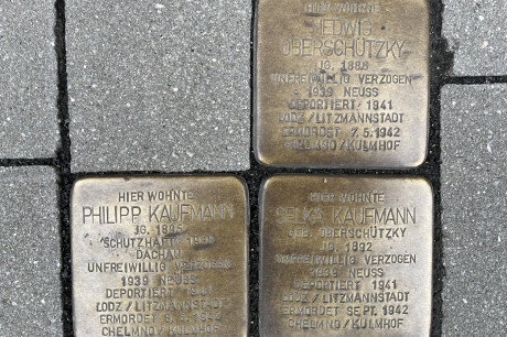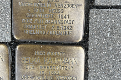 Philipp Kaufmann wurde am 04.06.1895 in Gustorf geboren. Er heiratete Selka Oberschützky, als Beruf wird Schuhhändler angegeben. Vom 17.11.1938 bis 19.12.1938 wurde er im Konzentrationslager Dachau in Schutzhaft inhaftiert. Nach dem unfreiwilligen Verzug der Familie nach Neuss wurde Philipp von dort aus im Jahr 1941 mit dem Transport 13 ab Düsseldorf ins Ghetto Litzmannstadt verbracht, von dort weiter am 07.05.1942 ins Vernichtungslager Kulmhof deportiert und dort am 08.05.1942 ermordet. Er wurde 47 Jahre alt.