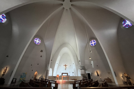 Platz der Kinderrechte: Die nach Plänen von Gottfried Böhm bis 1959 errichtete Kirche Zur Heiligen Familie in Köln-Sülz war ursprünglich die Kirche für das damalige Waisenhaus am Sülzgürtel. Nachdem die Einrichtung ab 2009 schrittweise verlegt wurde, erfolgte 2020 der Umbau der Kirche zu einem mulifunktionalen Veranstaltungsort nach Entwurf von Nebel Pössl Architekten.