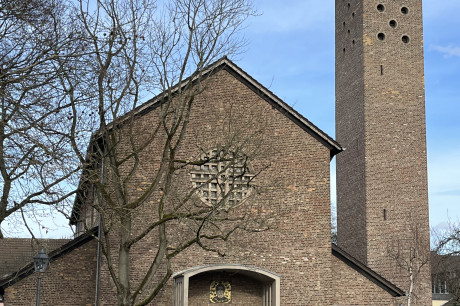 am Ende des Clarenbach-Kanals: Zusammen mit dem in den 1920er Jahren auf dem ehemaligen Festungsring realisierten Inneren Grüngürtel entstand der Aachener Weiher und der von ihm nach Westen führende Lindenthaler Kanal. An der westlichen Stirnseite des 1925 angelegten Kanals baute der Düsseldorfer Architekt Franz Schneider 1934-36 eine erste Kirche. Starke Kriegsschäden wurden bis 1954 durch den Wiederaufbau nach Plänen von Kobes Bong beseitigt. Statische Mängel erforderten schon bald einen Neubau. Den beschränkten Wettbewerb zwischen den Architekten Gottfried Böhm, Paul Schneider-Esleben und Hans Schwippert entschied Böhm 1964 für sich, 1968-70 entstand der heutige Bau auf der Basis überarbeiteter Pläne.